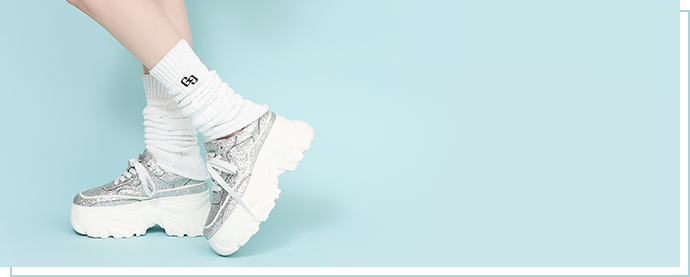 スニーカーから覗くロゴ刺繍がキュート