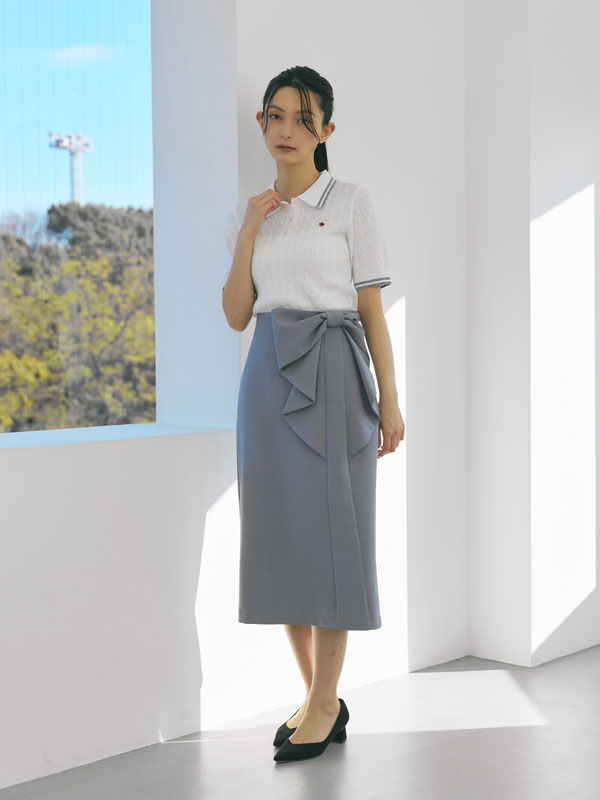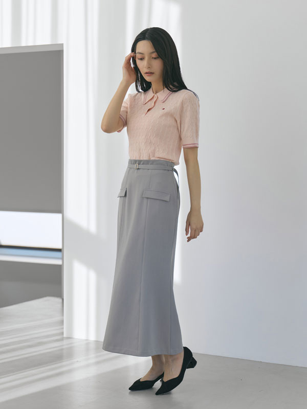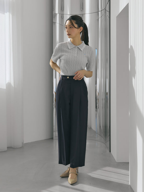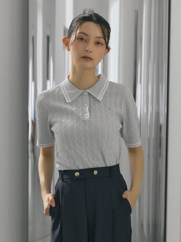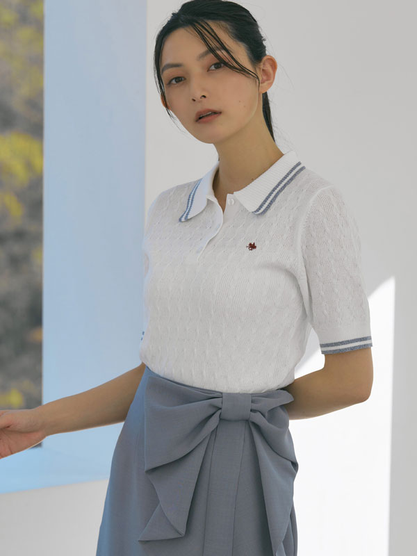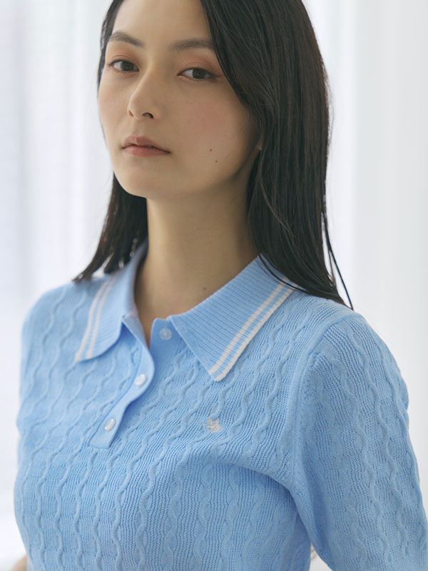 ポリエステル×ナイロンの軽やかなサマーニット素材を使用し、3月から夏まで快適に着られる仕上がりに。トレンドのケーブル編みと配色ラインで程よくクラシカルな印象をプラス。