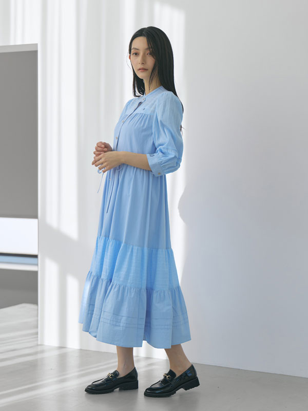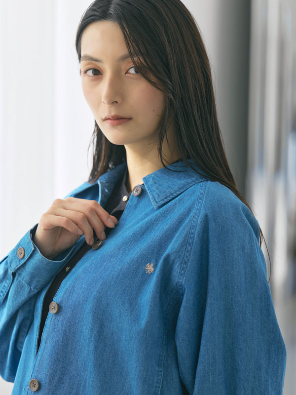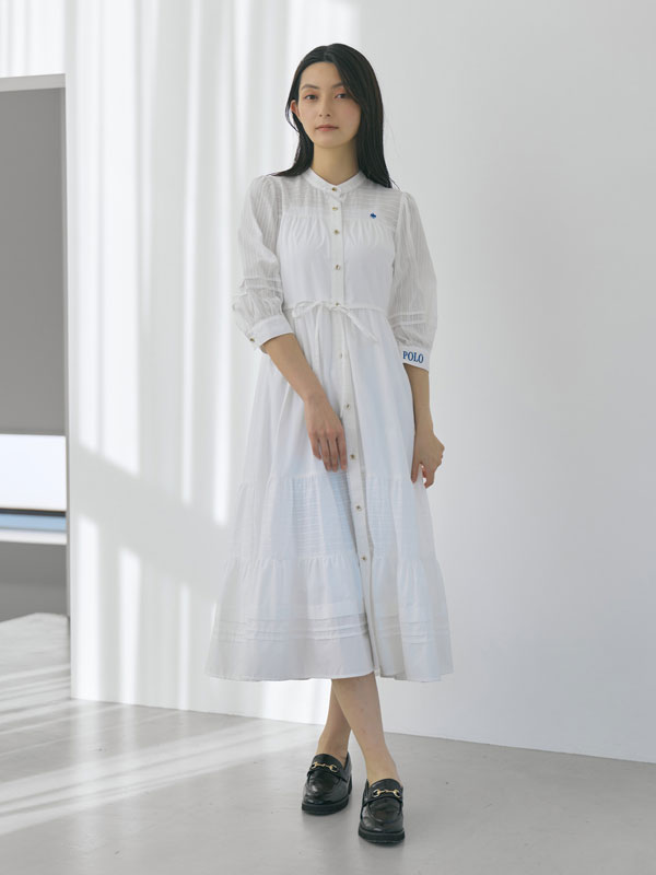 胸元にはプレイヤー刺繍、カフスにはPOLOロゴ刺繍をあしらい、コラボならではのトラッドなアクセントを効かせたコットンレースワンピース。ウエストリボン付きでシルエット調整も可能。羽織としても着用できる汎用性の高さも魅力。バンドカラーやゴールドボタンでトラッド感を残しながら、ギャザーやレース切替で柔らかなボヘミアンムードを演出。