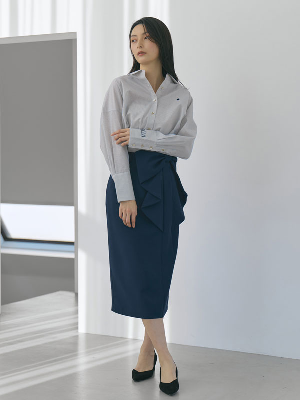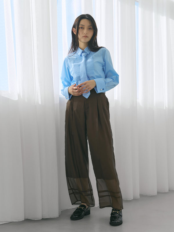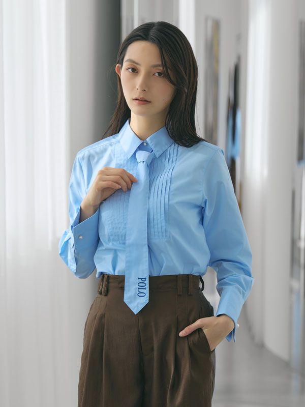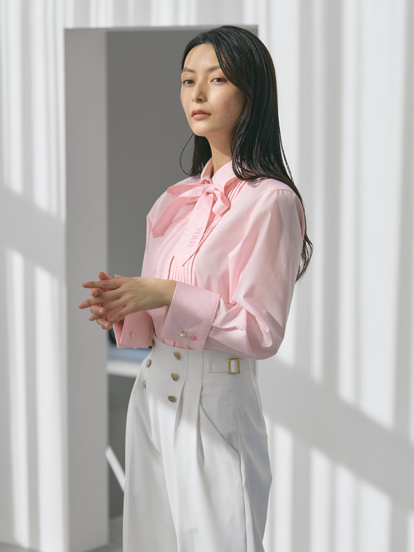 タイ・リボン・そのままでも着回せる、ピンタックが映える3WAYデザインシャツ。ハリのあるポリエステル×コットン素材で、シルエットを美しくキープ。胸元のピンタックが上品な印象を与え、ネクタイやリボンを合わせても、外しても決まるデザインに仕上げました。袖のダブルカフスとパールピン、プレイヤー刺繡もポイントです。