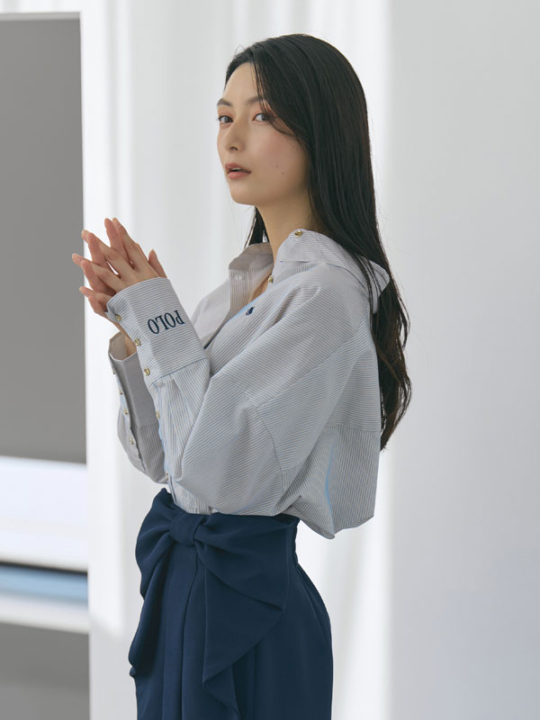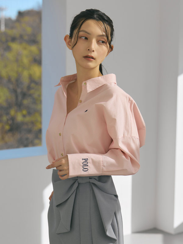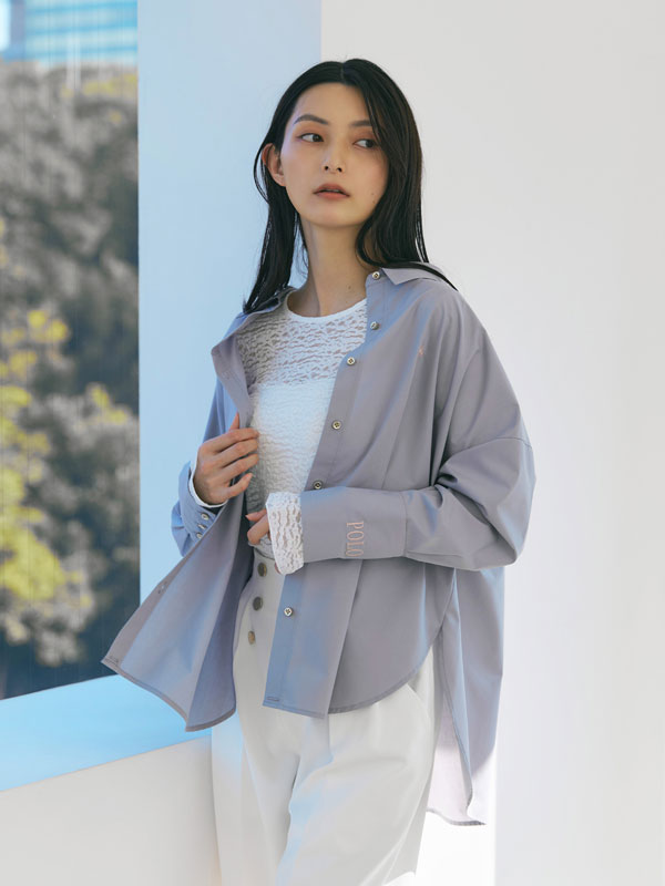 着るだけでこなれ感のある、計算されたサイジングのオーバーシャツ。春らしい刺繍の配色と、胸元のプレイヤー刺繡、カフスのPOLOロゴ刺繍がアクセントに。ストライプ柄も春らしくアップデート。表情感のあるドビーストライプ素材がフレッシュながらもフェミニンば印象を与えてくれます。マットな素材にツヤのあるゴールド釦が映え、スタイリッシュな印象に仕上げてくれます。